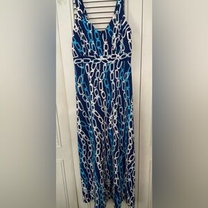 Keywords: J. McLaughlin, maxi dress, blue dress, chain print, sleeveless dress, V-neck dress, spring fashion, women's clothing, casual dress, beachwear, machine washable, nylon dress, spandex dress, polyester dress, pre-owned dress