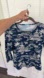 Elegant navy top with intricate white and beige patterns. Features a round neckline.