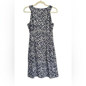 Chic J. McLaughlin dress featuring a striking navy and white abstract pattern. Ideal for versatile styling. I’m 5’5, size 4/27 and this fits me perfectly and hits right above the knees.