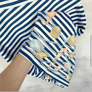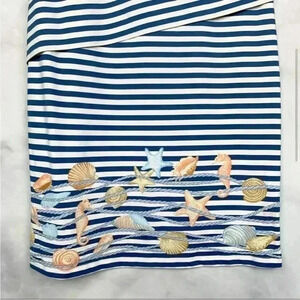 Shells, rope, starfish & seahorse ocean graphics at bottom hem.