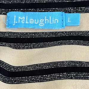 J. McLaughlin Nicola Tiered Bandage Dress - Size Large. Great pre-owned condition. One tiny pick spot on the top of the right shoulder, shown in pic. Boatneck, 3/4 sleeve, catalina cloth, knee length. Stripes are black, silver metallic and cream. Approximate measurements: 19 1/2" bust, 17 1/2" waist, 39" length.