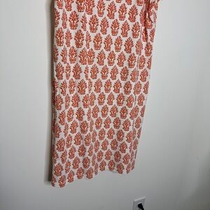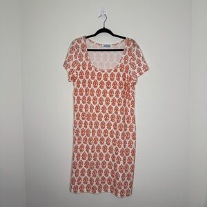 Vibrant mini dress with orange patterns. Short sleeves and scoop neckline. Perfect for casual outings. Great condition.