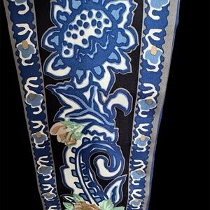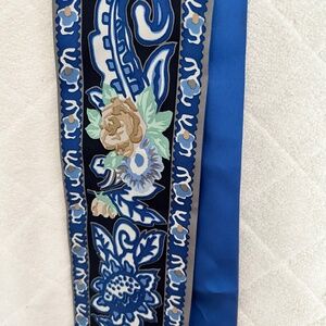Scarf from J McLaughlin in shades of blue white and green. 100 silk, measuring 4 inches wide by 66 inches long. Can be worn as a scarf or a sash or belt. New without tags.