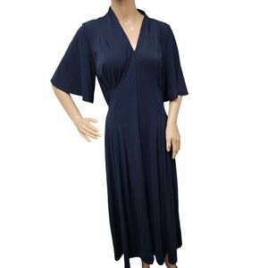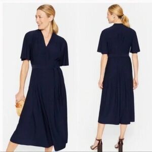 This is a J. McLaughlin Shilow Jersey V-Neck Flutter Sleeve Pleated A-Line Midi Dress in Navy Blue. No belt. Can easily be worn without one. Stretchy.