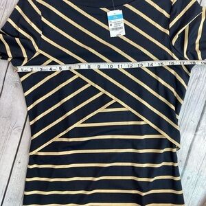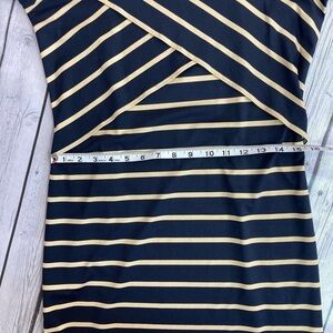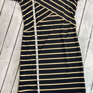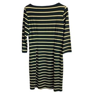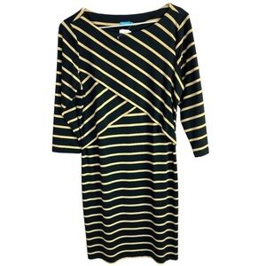 J. McLaughlin boat neck layered black and tan Midi dress with 3/4 sleeves.