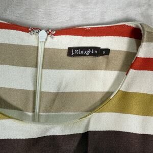 The J McLaughlin Striped Shift Dress in size 6 features a colorful red, green, and brown striped pattern, making it perfect for various occasions such as travel, parties, casual wear, or business events. This knee-length dress has 3/4 sleeves and a round neck with a zip closure. Made from a blend of Egyptian cotton and polyester, it offers a comfortable and stylish fit. The dress also includes preppy pockets, adding a touch of sophistication to the classic and preppy overall style.
