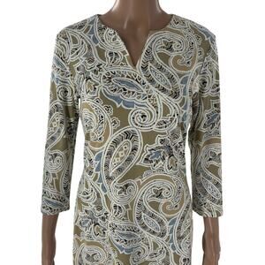 J. McLaughlin Carly taupe paisley print sheath dress. Catalina cloth fabric. V neck. 3/4 sleeves. Pulls on. Nylon / spandex. Machine wash. In preowned condition.