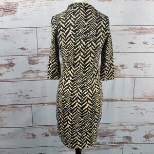 J. McLaughlin Terin Ruffle Neck Dress in "Tigre" which is a black and tan animal pattern. 3/4 sleeves, ruffled neckline, princess seaming. Form fitting bainbridge sheath dress. Excellent Preowned Condition, no flaws. Size Xs.