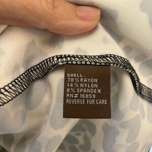 Dress features a small ruffle at the neck and 3/4 sleeves. Color/pattern is Mozambique/ Cream.