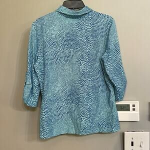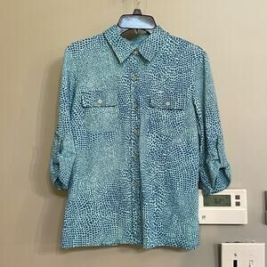 J McLaughlin Top Monroe Blue Leopard Print Catalina Button Down 3/4 Sleeve Sz L