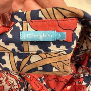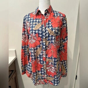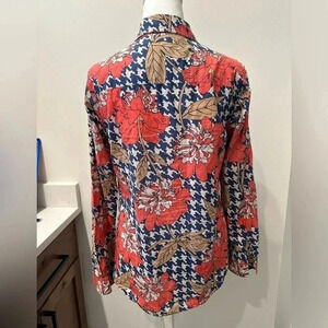 Navy, red, tan floral and houndstooth pattern button up. 100% cotton. Excellent pre owned condition; smoke free home.