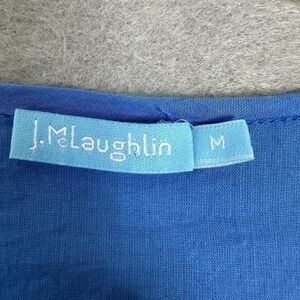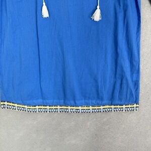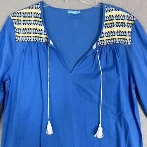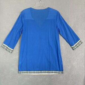 This J. McLaughlin tunic is perfect for your next resort wear or beach outfit. The 3/4 sleeve and V-neckline give it a relaxed fit, while the boho pattern and colorful blue hue add a touch of fun. Made of 100% cotton, this tunic is lightweight and breathable, making it great for those hot summer days. Whether you wear it as a top or a mini dress, this J. McLaughlin tunic is sure to become a staple in your casual wardrobe. It's perfect for the pool or a day out, and its semi-sheer fabric adds just the right amount of sexiness. Get ready to turn heads and feel comfortable at the same time with this versatile tunic.
