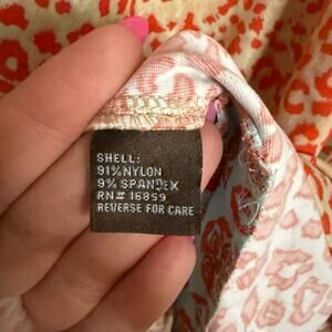 Orange and red leopard print with contrasting mint green trim