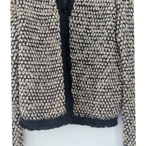 Elegant textured jacket. Black fringe trim accents and optional open front design.