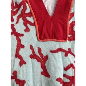 Pre-owned J. McLaughlin vneck sweater in blue and red. Cotton, modal, and spandex blend tight knit that's lightweight. Bright coral pattern with neckline accent. 3/4 length sleeves. V-neck. Preppy, beach, tropical, resort, vacation, nautical, coastal, office, casual. In used condition, overall light pilling and rub wear, 2 spots of minor discoloration - see photos for details.
