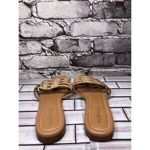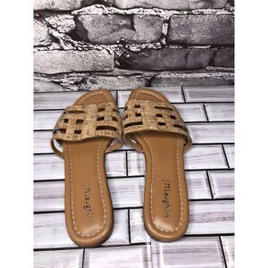 Selling J. McLaughlin WILLA Tan Leather Cork Flat Slides Sandals Women Sz 7.5M US/37.5EU