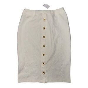 This knee-length pencil skirt by J. McLaughlin is crafted in a sophisticated white fabric, perfect for both work and casual settings. Its fitted silhouette offers a sleek and polished look, making it an ideal choice for resort wear as well. The gold accents add a touch of elegance to this versatile piece.