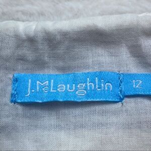 J. McLaughlin White/Blue Striped Linen Skirt Size 12. Excellent used condition. Body 100% linen, lining 100% cotton. White fringe layers. Side zipper. Measures waist 35”, length 21.5”.