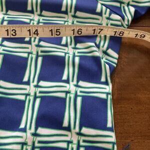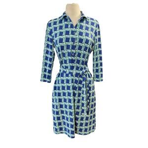 J. McLaughlin Women's Belted Dress SZ M Blue Square Print Stretch Retro in great preowned condition