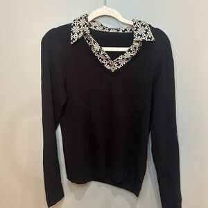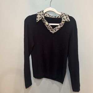 J McLaughlin Women's Black V Neck Sweater with Decorative Collar Long Sleeve