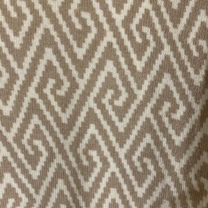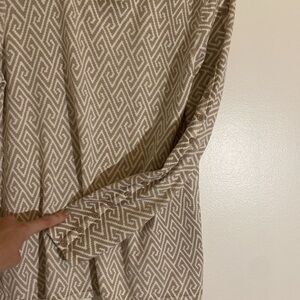 Stylish long sleeve sweater with a geometric pattern. Features a blend of cream and tan colors.