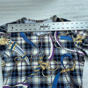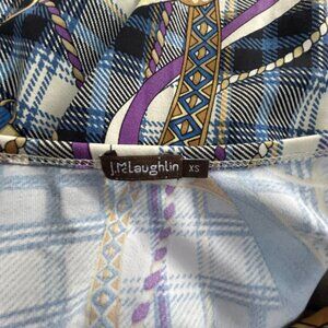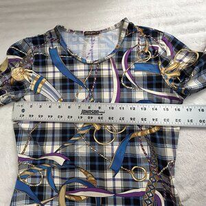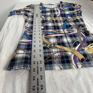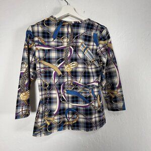 This J. McLaughlin Women’s Top is a polished piece with classic equestrian flair. Featuring a horsebit print in blue, purple, and tan tones, it’s crafted from a stretchy knit fabric with 3/4 sleeves and a tailored silhouette. Perfect for smart casual styling, office wear, or weekend refinement, this top blends comfort with timeless design.