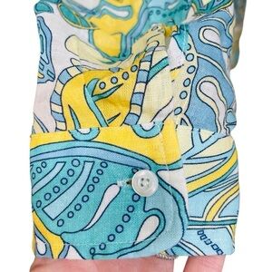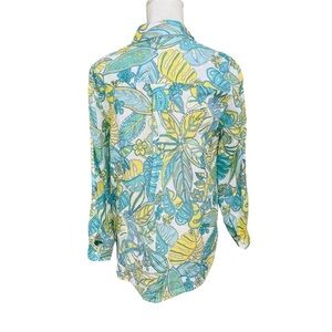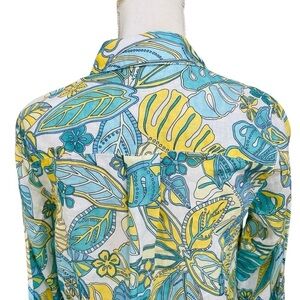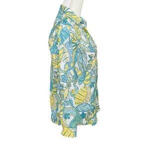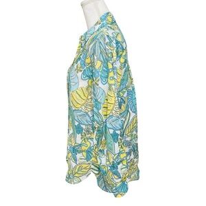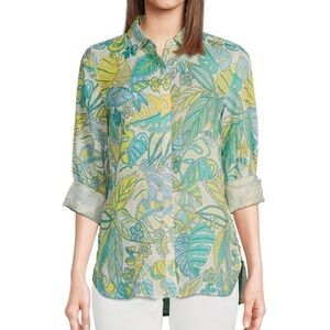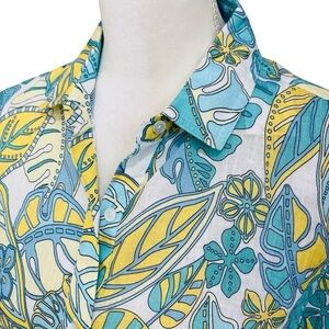 J McLaughlin Women’s Linen Shirt Aqua Yellow Tropical Print Button Down NWT $188