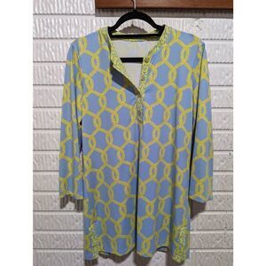 J. McLaughlin Women's M Light Blue And Yellow Green Patterned Nylon Tunic Top