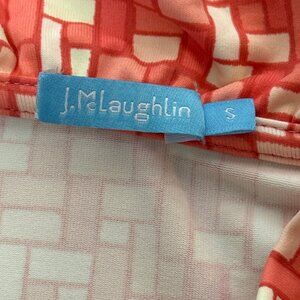 This J. McLaughlin top combines a vibrant geometric red and white pattern with a delicate ruffle neckline and 3/4 sleeves, offering refined style.