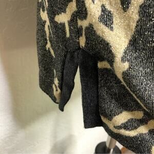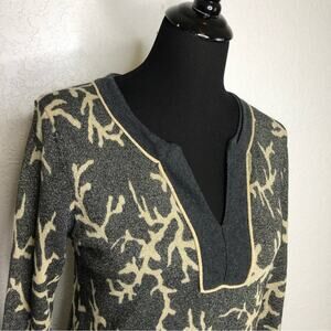 J McLaughlin gray tan metallic knit coral print sweater. Pullover style with round v notched neckline. Midlength sleeves. Side slit hemline. Size Medium. Excellent preowned condition. One tiny snag on sleeve.