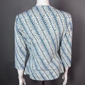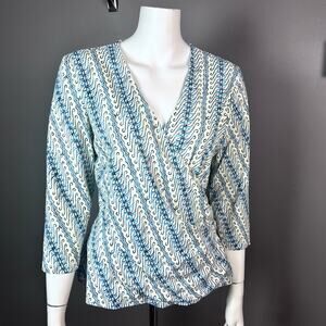 J. McLaughlin top Large faux wrap long sleeve v-neck cream blue stretch slimming