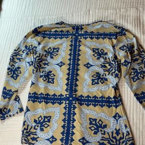 Excellent condition J McLaughlin Catalina cloth top in a blue and tan print. No pills or stains. Size Small. Waist length, fitted.