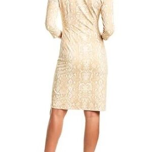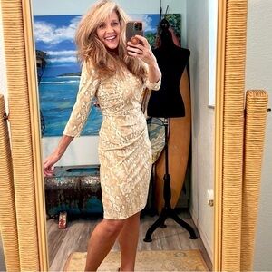 J. McLaughlin,Sage Dress, Cream/Gold Textured Ruched Sheath Slimming,EUC, Size S