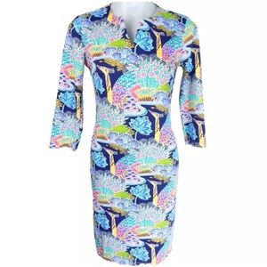 Item: Women's Carly Paradis Peacock Floral 3/4 Sleeve Catalina Cloth Stretch Knit Shift Dress