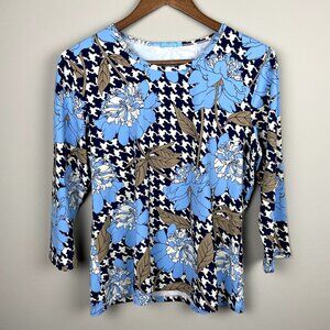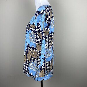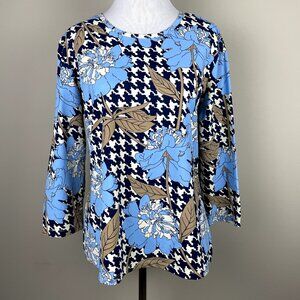 J. Mclaughlin Catalina Cloth Top Womens Large Blue Floral Blouse 3/4 Sleeve Tee