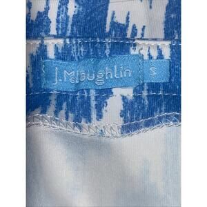 The J. McLaughlin dress in size small features a blue and white geometric print, a square neckline, and short cap sleeves. Made from rayon fabric, this knee-length dress is perfect for various occasions including travel, weddings, parties, and casual outings. The dress also includes stretch accents, quick-dry material, convenient pockets, and moisture-wicking properties, making it a practical and stylish choice for the summer, fall, and spring seasons. With its fit & flare and A-line style, this dress from a reputable brand is a must-have for any fashion-forward woman.