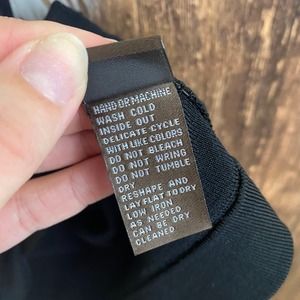 features | slight scoop neck, short sleeves, long waist, flared skirt, thick black rib knit fabric