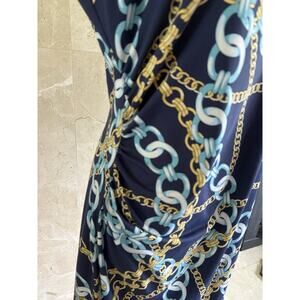 J. McLaughlin’s iconic Catalina Cloth strikes again—this stunner is all about effortless polish. Sleeveless silhouette, flattering rouching detail at hip, and vibrant Blue and Gold chain print make it a go-to for everything from garden parties to gallery strolls.