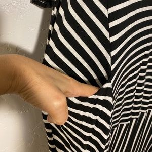 J Mode USA boat neck dress, short sleeves, with pockets (see pic #5), black and white stripes, size 2X. Bust-armpit to armpit around 45 inches (not stretched), length 42 1/2 inches. Worn ONCE!