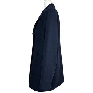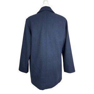 J Percy women's navy blue size 14, it is double breasted, accent nautical buttons, collared, long sleeves, hand warmer pockets, can be worn a few ways, lined and vintage 90s. Materials shell 100% merino wool, lining 100% acetate. Care dry clean only. Condition is preloved good as shown in pictures. Please preview the measurements to ensure fit.