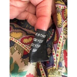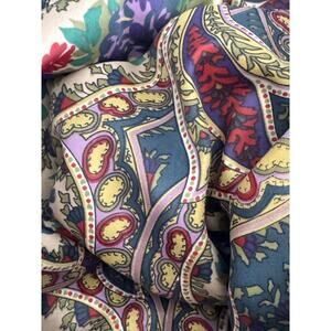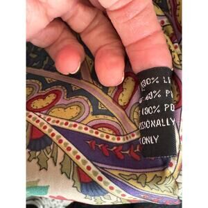 Vintage preowned condition, unique jacket by J. Percy for Marvin Richards is both suede and cowhide leather. The suede part of the jacket is a gray blue color. Black leather goes over the shoulders and across the back. This parka style jacket is hooded with photographer around the hood. The inside of the jacket is a beautiful polyester, paisley print. This jacket zips and has frog style closures in the front with horn buttons. Two snaps at the neck and one at the hips. Elasticized at the hips. Two large pockets in the front. Sleeves are also elastic size at the wrist. This jacket shows where at the edges and some color variations. But it is such a beautiful and well-made jacket those imperfections look rich. Fully lined. Measurements are taken flat and are approximate. There is no size tag so the measurements were taken as closely as possible.