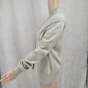 Cardigan is v neckline, shell or MOP buttons, long sleeves with ribbed cuffs.