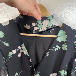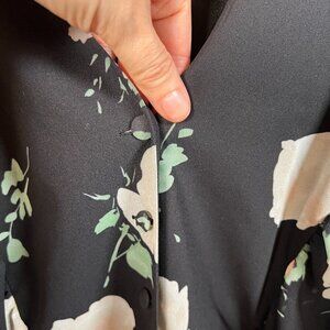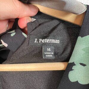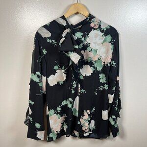 J. Peterman Cutout Ruffle Tie Neck Top Blouse Size 14 Black Floral Work Office