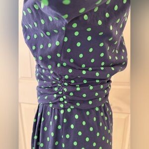 The J Peterman Dress in size 10 features a stylish faux wrap top design with ruching at the waist and a zip closure at the back. The dress has a V-neckline and a knee-length hem, perfect for various occasions such as parties, weddings, or casual events. Made from 100% cotton knit fabric, the dress is in a classic polka dot pattern in blue and green colors. With its slimming silhouette and comfortable fit, this dress is a versatile addition to your wardrobe, suitable for both professional and social settings.