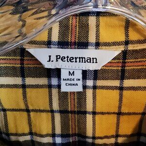 This J. Peterman plaid shirt dress in size Medium, featuring a classic button-down design in rich yellow, black, and white flannel, this piece captures timeless Americana with a modern twist.