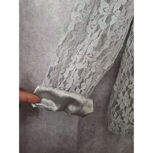 The J. Peterman Silver Necktie Lace Jacket is a stylish and delicate piece perfect for a variety of occasions, from casual to formal. Made from a cotton blend with a sheer lace fabric type, this mid-length jacket features a unique tie closure and a collarless design. The silver color and dainty accents like the bow add a touch of elegance, making it a versatile option for the fashion-forward woman. With its lightweight and breathable properties, this jacket is ideal for layering in the summer, fall, or spring seasons. PTP 23 in. Length 27 in. Sleeves 25 in.