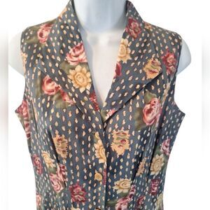Vintage Y2K sleeveless midi dress V neck collar, button down front, fitted bodice with flare, full skirt, pockets, 100% crisp cotton colorful floral pattern size 6 measures flat 17" pit to pit, 46" long Excellent condition, no signs of wear