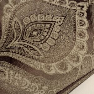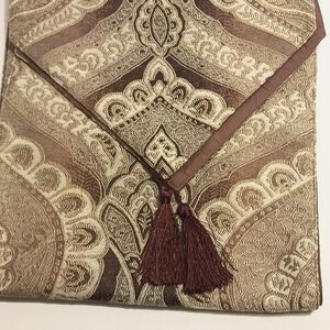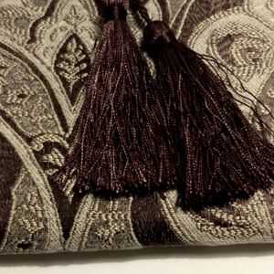 96" long inclusive of Tassels. 13" wide. Color is like a mauve and silver tone.