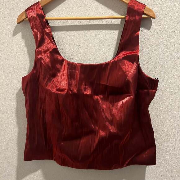 Elegant J.R. Nites Woman red shimmery tank top camisole, size 16W. This top features a rich, deep red color with a subtle sheen, perfect for an evening out or a special occasion. Made from a blend of polyester, rayon, spandex, and nylon, it offers a comfortable fit. The top is fully lined with 100% polyester for a smooth feel. In excellent pre-owned condition with no noticeable flaws.