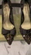 PRE-LOVED AUTHENTIC J. RENEE ‘CHARISH COLLECTION’ BLACK & GOLD SATIN MESH; LACE SEQUIN BOW POINTY STILETTO PUMPS.